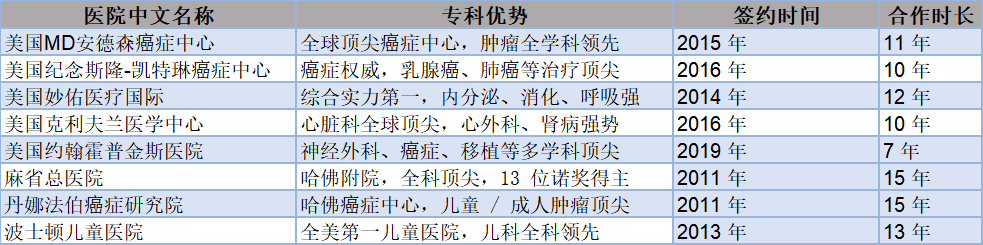 合作医院:覆盖美国、日本、韩国、泰国,以轻医疗旅游为主。