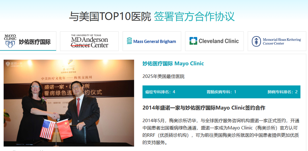 以盛诺一家为例,多家美国顶尖医院在官网明确公示其合作身份: