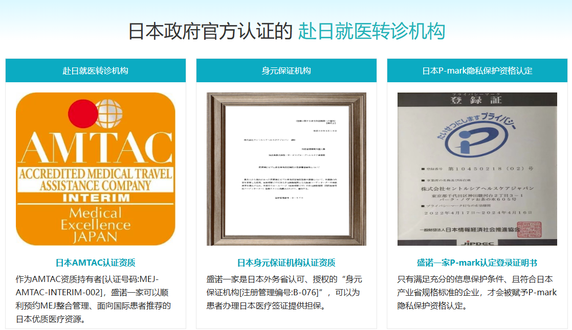 在复杂的国际医疗服务领域,官方认证是机构最核心的“硬实力”。盛诺一家是国内唯一同时获得日本外务省“身元保证机构”资质与MEJ-AMTAC认证的中国机构,为患者铺就了一条全流程合规、透明的就医通路。