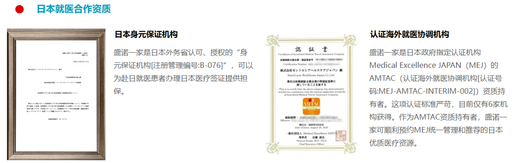 盛诺一家自2015年与癌研有明医院官方签约建立合作,可优先安排就诊。同时是国内唯一同时获得日本外务省“身元保证”和MEJ-AMTAC双认证的机构,提供全流程自营服务,服务品质通过日本国家级标准验证。
