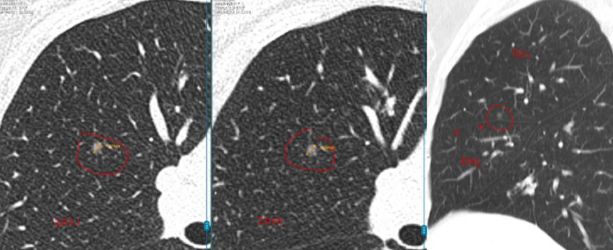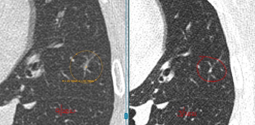 然而在随后的一次复查中,CT结果显示磨玻璃结节“密度略微增加”,而且又新出现了一枚3mm的小结节。