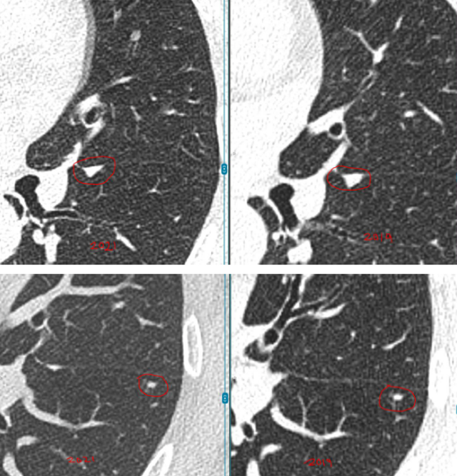 “先看左肺这两枚实性结节,它们在这几年一直很稳定,没有明显增大,形态也没有变化。像这类稳定超过3年的小实性结节,良性可能性超过了99%。从片子上看,它们更像是肺部之前因为旧损伤留下的痕迹。”L教授说。